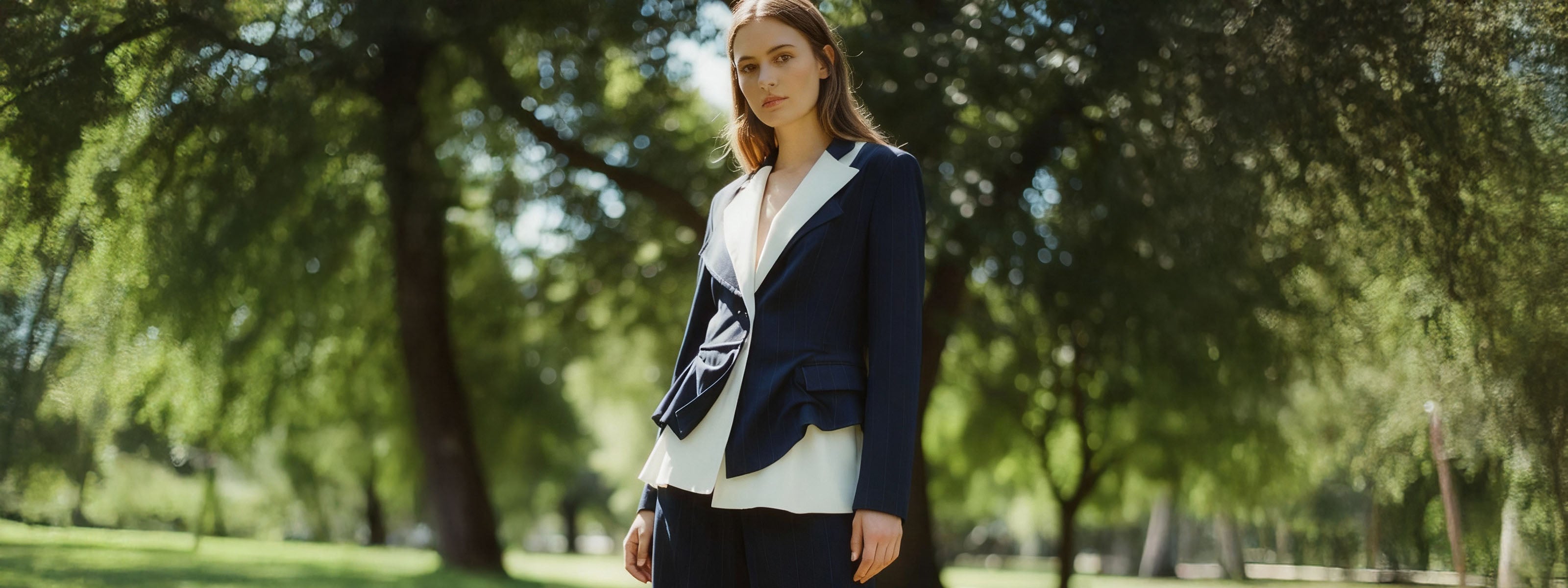 Mandarin collar with a small front V-slit and matching fabric ties for optional closure. Long sleeves with buttoned cuffs. Back pleats. Asymmetric hem.