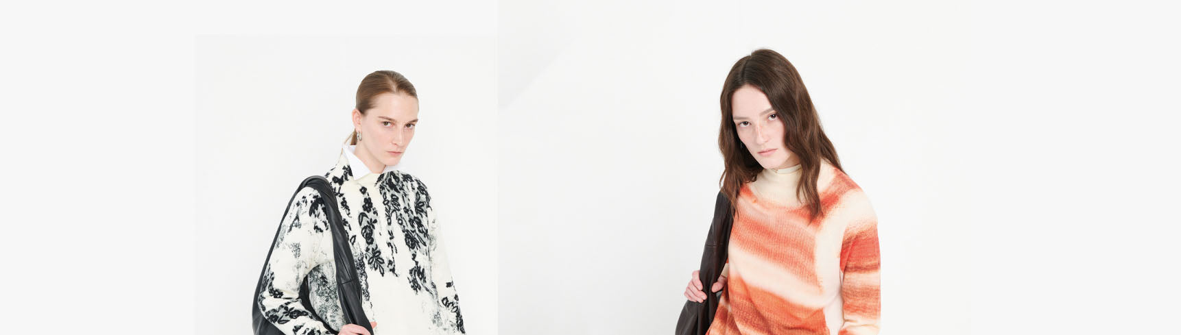 Front view of the NEUTRON sweater with boxy silhouette, soft grey and cream gradient tones, and pink floral motif on the left side.Front view of a woman wearing the NEUTRON sweater with boxy cut, gradient colors, and pink floral motif on the left side. Paired with a wide scarf and black trousers.